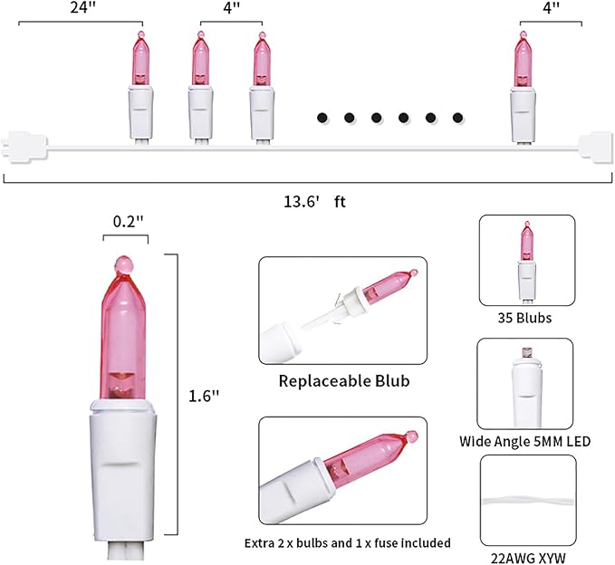 - 【Mini Christmas Lights Specification】: 1 Sets - white wire chritsmas light string includes 35 count pink LED lights, total length 13.6ft, lights length 11ft and each led is 4 inches apart, 24 inches lead wire, 4 inches end connector (Extra 2 x bulbs and 1 x fuse included)
