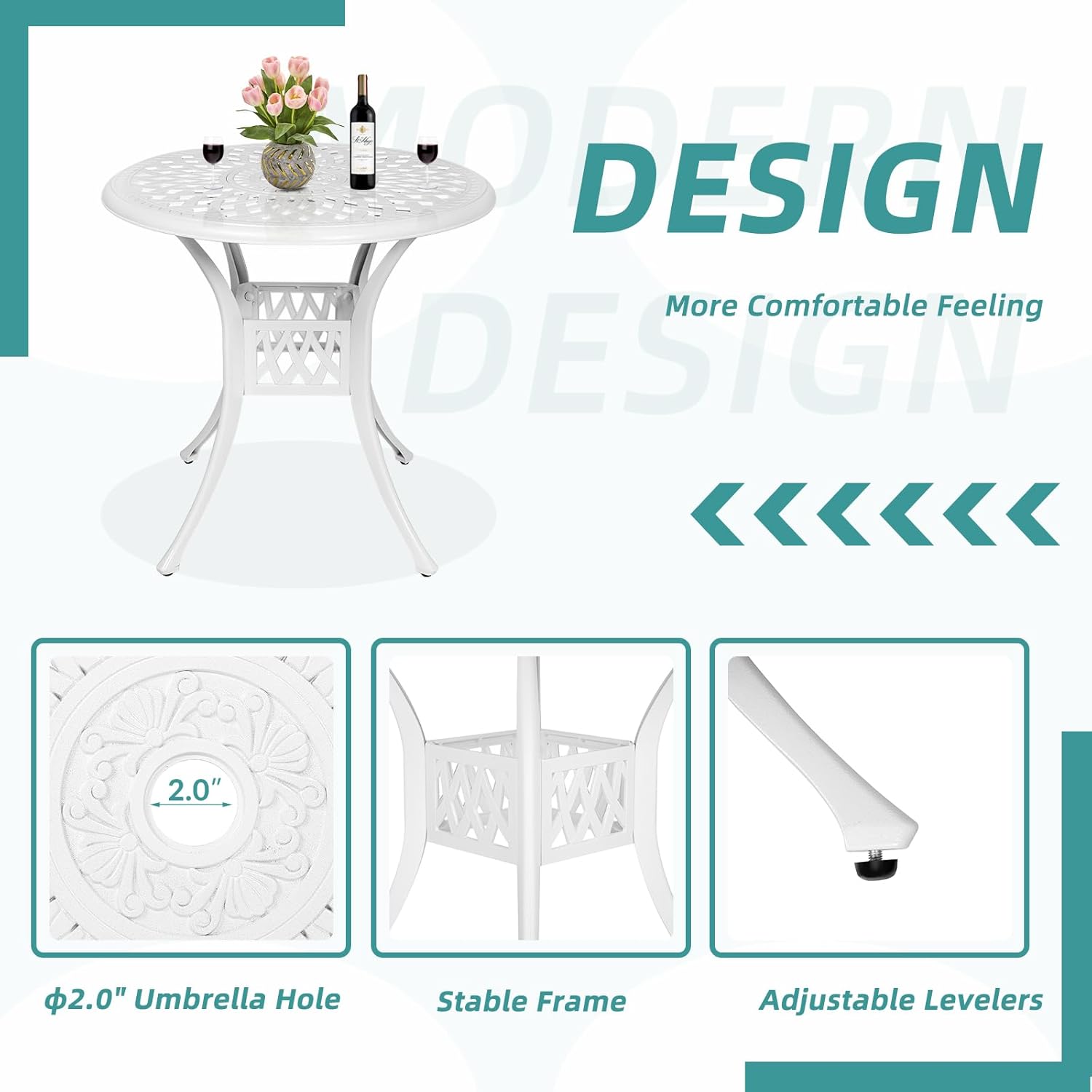 MEETWARM 3 Piece Patio Bistro Set, Outdoor All-Weather Cast Aluminum Dining Furniture Set Includes 2 Chairs and a 31” Round Table with Umbrella Hole for Garden Deck, White