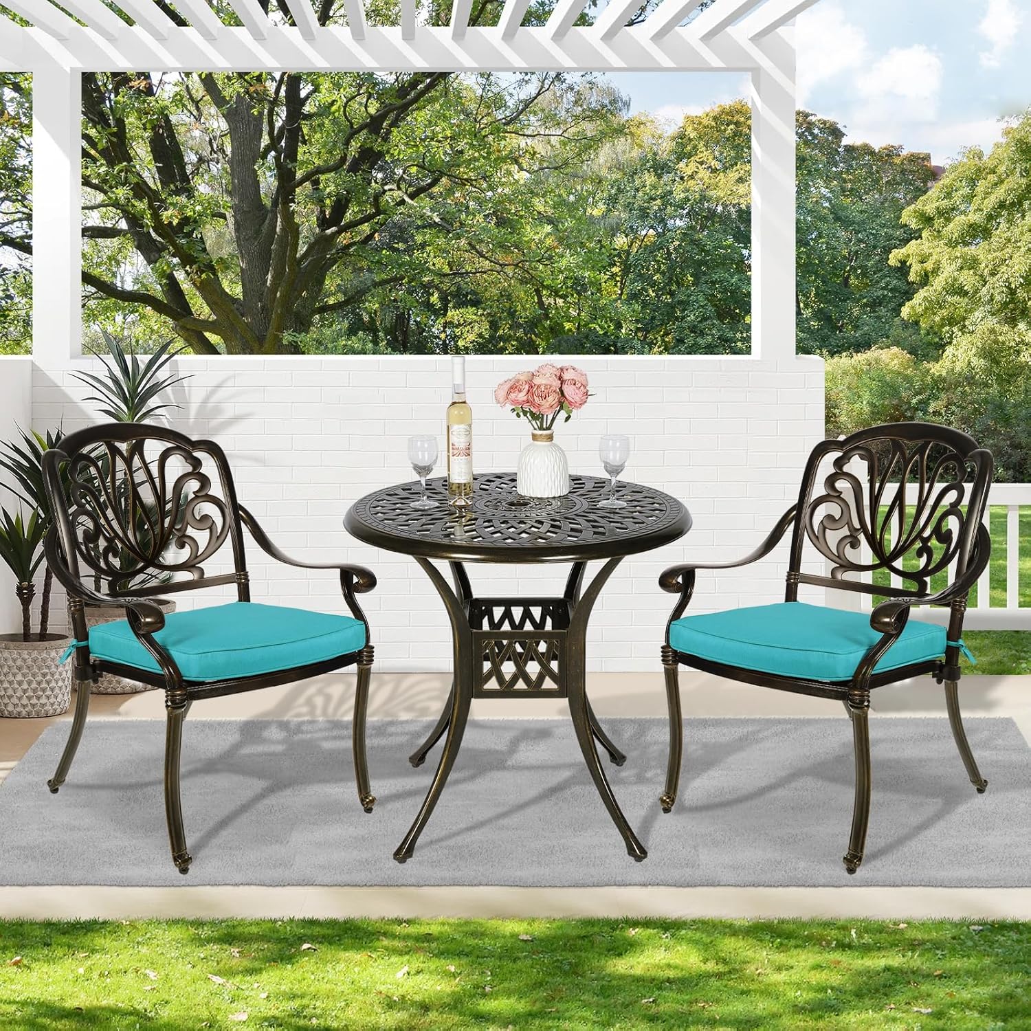 MEETWARM 3 Piece Patio Bistro Set, Outdoor All-Weather Cast Aluminum Dining Furniture Set Includes 2 Cushioned Chairs and a 31” Round Table with Umbrella Hole for Garden Deck, Ocean Blue