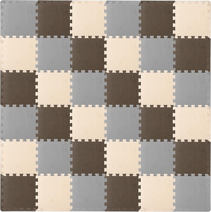 ProSource Foam Puzzle Floor Play Mat for Kids and Babies with Solid Colors, 36 or 16 Interlocking Tiles with Borders, Brown/Beige/Grey