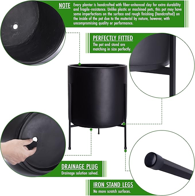 - Versatile and Stylish Planter Set: Handcrafted fiber clay pot and metal stand for small to large plants. The pot and planter stand are matching in size perfectly, use them together or separately to create different looks and styles.