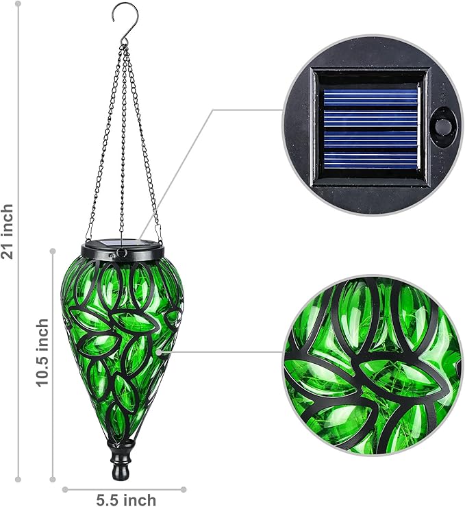 - Unique Design: Translucent plastic ceiling lantern features an inverted teardrop shape surrounded by a leaf frame metal cage with a plastic lampshade in green. The solar hanging lantern will sparkle in the sunshine during the day.