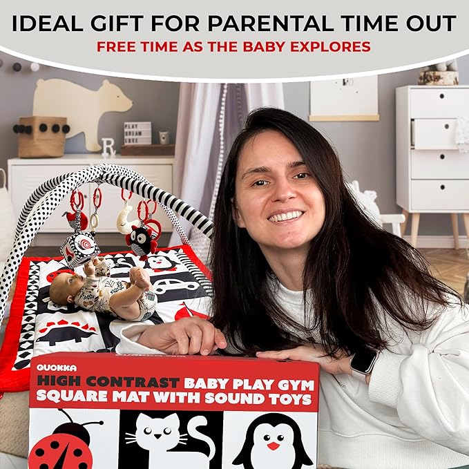 QUOKKA Padded Baby Gym Mat for Floor Tummy Time - High Contrast Baby Kick and Play Gym Mat - 6 Toys | Thick Pad | Machine Washable | Black White Red Colors for Vision Development