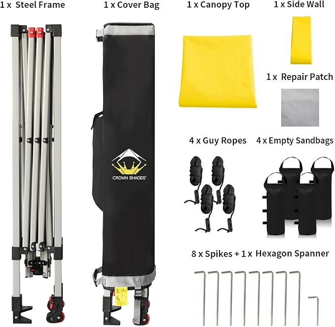 CROWN SHADES 8x8 Pop Up Canopy with 1 Side Wall - Beach Tent with One Push Setup - Outdoor Sun Shade for Events, Parties, Camping - Gazebo with STO-N-Go Cover Bag (Yellow)