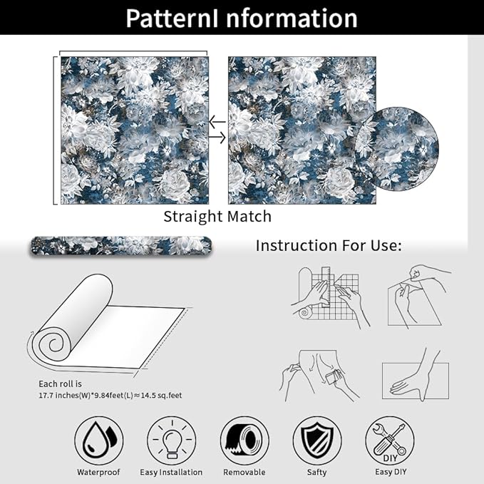 - Features: Easy peel off wallpaper - suitable for tenants' home decoration concept. This floral wallpaper is made of high-quality durable vinyl material and eco-friendly ink. We have improved the quality of the wallpaper to be more sturdy and opaque to avoid tearing and perspective issues. This wallpaper also has a matte surface, good texture, waterproof, and detachable. There are grids and sizes on the backing paper, and you can easily cut according to the size you need.