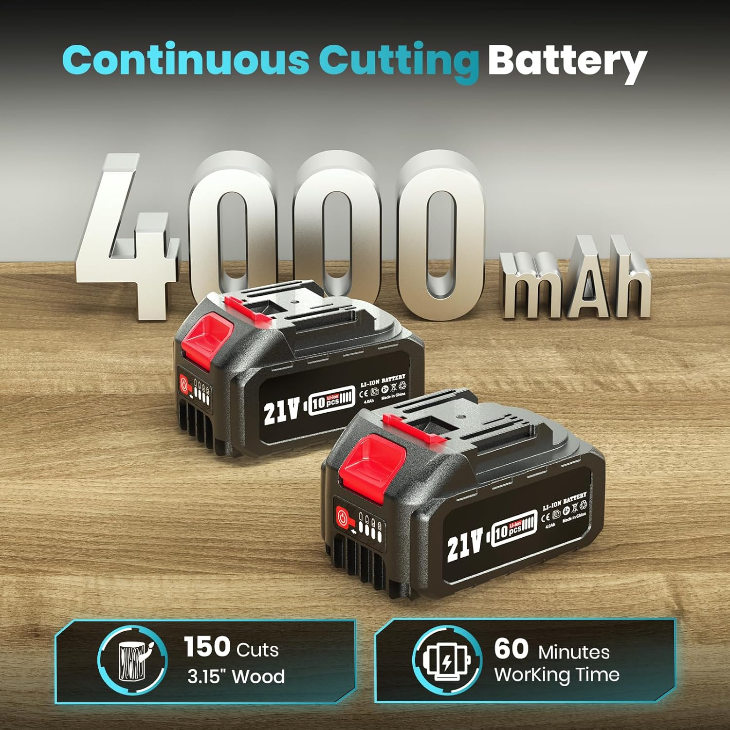- ✅【2x4.0Ah BATTERY, NO DOWN TIME】We know that the battery life of the mini cordless chainsaw is your most important concern. Our Rechargeable electric saw is equipped with 2 Pack 4.0 batteries which can hold a charge for a long time. Rechargeable batteries with self-overload and temperature protection provide a much longer battery life.