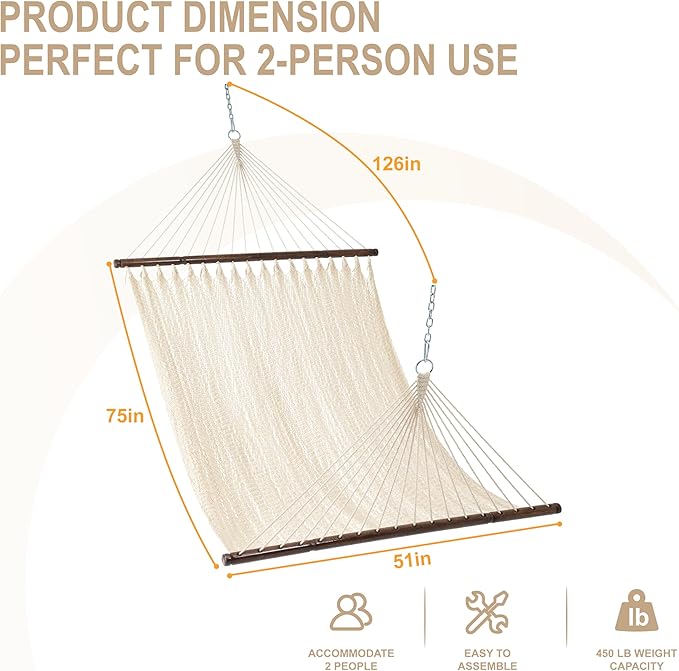 Lazy Daze Hammocks 10.5 FT Double 2 Person Caribbean Rope Hammock, Hand Woven Polyester Hammock with Spreader Bars, for Outside Outdoor Backyard Patio Poolside,450 LBS Capacity, Cream
