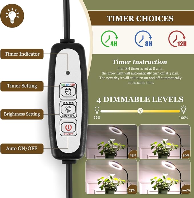- 【3 Timer Setting with 4 Brightness Levels】With the built-in 4/8/12H timer, you can easily set any lighting schedule. The light can be set to automatically turn on and off at specific times every day, promoting consistent plant growth. With 4 adjustable brightness levels, you can customize the light intensity to suit different plant growth stages. The eye-friendly and energy-saving design ensures optimal growing conditions while saving energy.