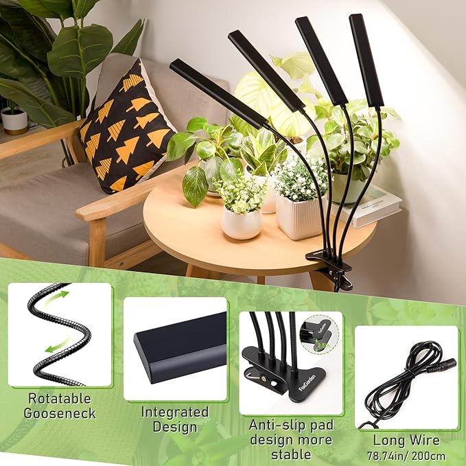 - Flexible Gooseneck & Sturdy clip: The FOXGARDEN plant light is designed with a versatile gooseneck and a sturdy clamp featuring anti-slip properties, ensuring effortless installation on any deskor plant stand. This setup allows you to position the grow light in any direction, enabling optimal lighting angles for comprehensive coverage around your plants. Additionally, the design is plant-friendly, with no extra components that could potentially harm your plants.