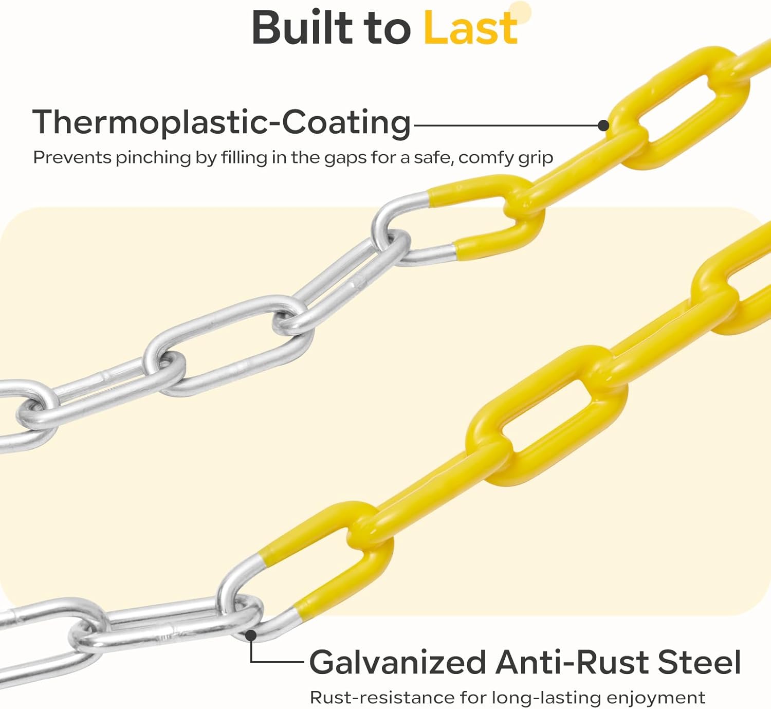 - 【Anti-Rust Coated Chains 】Decorlife swing set include two 66 inch long zinc-plated heavy duty chains, 30 inch of which covered thermoplastic coating (industry-leading 0.5mm thickness) to prevent finger pinches no hair snags or tangles and resist rain/snow corrosion.