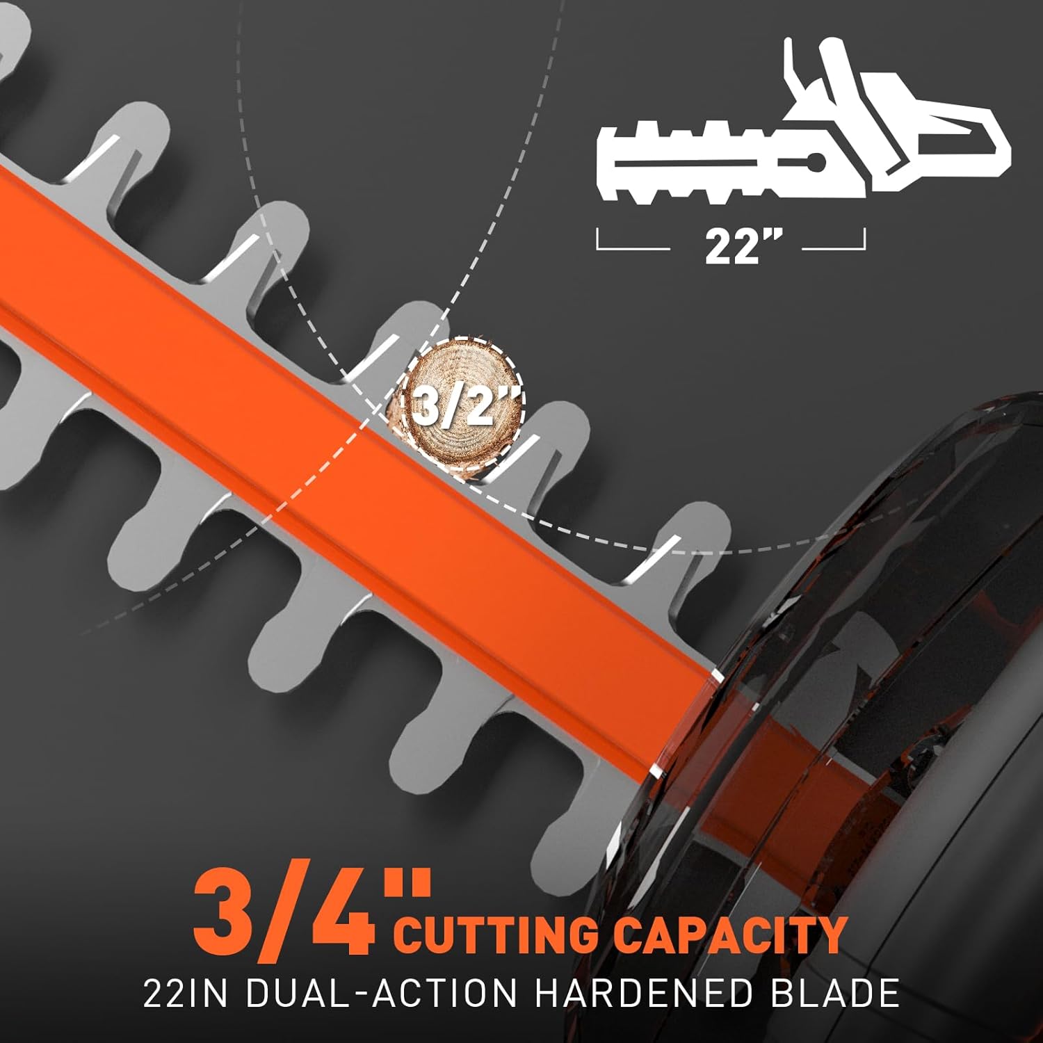 - 【22 Inch Dual-action Blade】 - With 22”Dual-Action Blade,powerful 3000 rpm brushless motor delivers larger cutting power for tough bushes. 22 inch sharp dual-action blade long enough to reach some hard-to-get area.