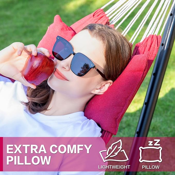 PNAEUT Double Hammocks with Stand for Outside, Portable Space Saving Heavy-Duty Steel Stand for Indoor Outdoor Patio with Carrying Bag, 450 lbs Capacity (Cherry)