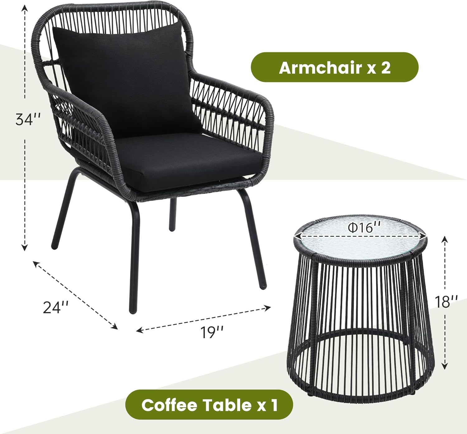 - 【DETACHABLE GALSS TOP】This 3 piece bistro setting includes a round glass top coffee table. You can put snacks or coffee on it, and you don't have to worry about cleaning things up when they tip over, because the glass is held in place by suction cups that you can remove. Make cleaning easier and faster.