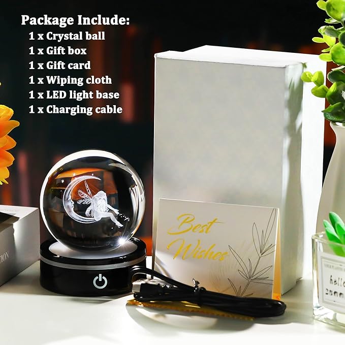- 3D Moon Fairy Crystal Ball: The Fairy figurine is made of high-quality k9 crystal making the crystal ball more transparent and glossier, 3d laser engraving technology design creates an exquisite fairy image inside. Intricate details of 3D laser engraving bring fairies to life. Even after a lifetime of use, crystals never lose their original shine