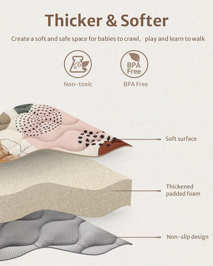 - Thicker & Soft Premium Foam - Our baby play mats for floor is thicker than most other brand baby play mat. And it's made of premium soft padding foam and fabric top layer to ensure a soft and cushioned surface, providing a comfortable place for your little one to relax, play and work on their developing skills