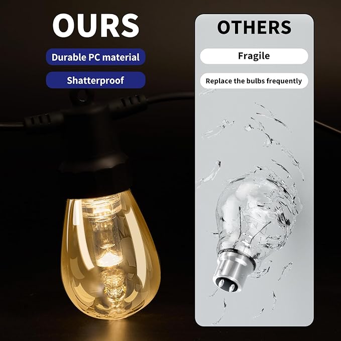 - IP66 Waterproof String Lights: With an IP66 waterproof rating, our hanging string lights can withstand rain, sun, wind, snow, humidity, and extreme outdoor temperatures. The LED bulbs are made from high-quality industrial-grade PC material and are designed to survive accidental collisions and drops.