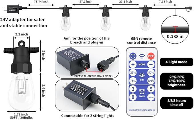 - Dimmable String Lights: Customize the brightness of these patio lights to 25%/50%/75%/100% to set the perfect mood with the dimmable feature. With the remote that comes with the product, you can easily schedule your patio string lights to turn off automatically after 3/5/8 hours.