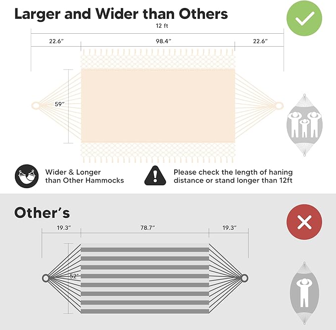 - Larger Bearing Capacity: The heavy duty hammock's total length (from loop to loop) is 144 Inches while the bed size is 98”long X 59”wide, making it perfect for couples