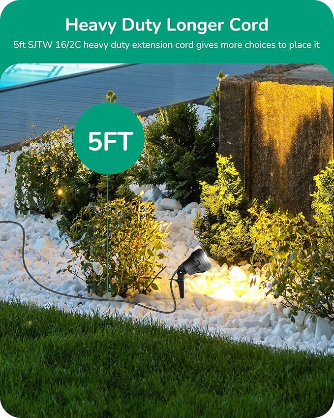 - [Easy Setup in Seconds] The small spotlight outdoor features a lamp head that can rotate 180 degrees, offering flexible installation angles; a 5ft SJTW 18/2C extension cord provides a larger installation range to meet the needs of long distances; easy to install on your own, no professional electrician knowledge required