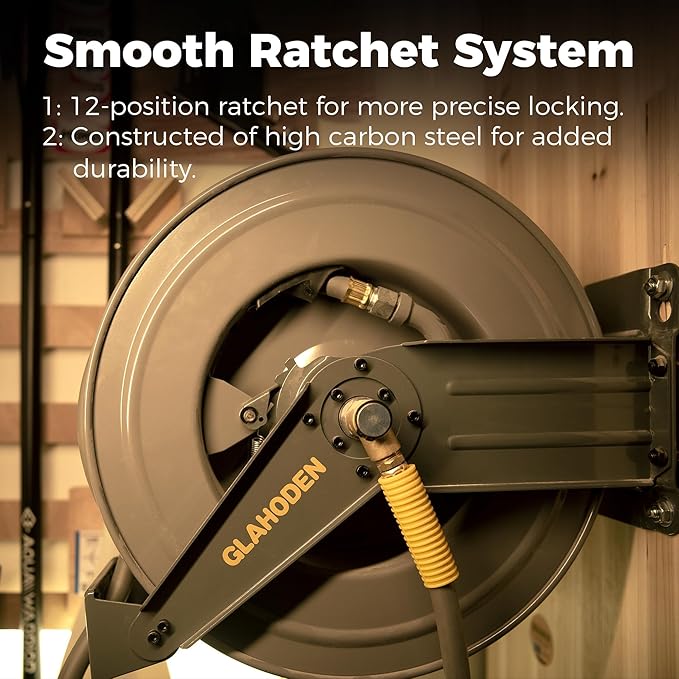 - Strong and Tangle-free Retraction: GLAHODEN retractable air reel uses a more powerful retracting spring, which maintains good tension even though it has been released recurrently 10,000 times. Self-leveling system winds the hose evenly, neatly and tangle-free, so that you say goodbye to "messy" workplaces from now on.