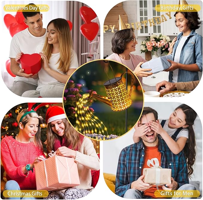- Suitable for Indoor & Outdoor Use:The solar watering can lights is suitable for 2 ways to use, you can hang it on outdoor garden, patio, patio, flower beds, paths, fountains and other outdoor spaces with the included 32 inch shepherd hooks and let it water your flowers like the stars; you can also hang it directly on the porch, wall, tree or place it on the window sill, table, balcony