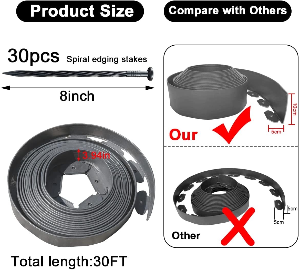 - Size:Landscape edging is 33ft length & 4in height; with 30pcs 8-inch spiral spikes.