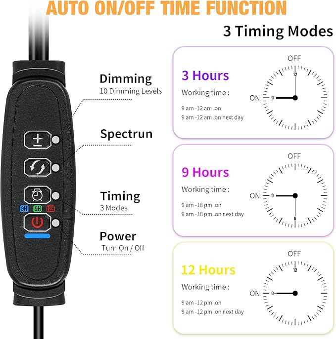 - 【Auto Turn on/off Timer Function】Our led grow lights have cyclic memory timing function, you can set 3/6/12 hours of timing, the plant light automatically on/off every day, no manual operation, so that you do not need to worry about your plant health problems when busy, because the plant light will take care of the plant instead of you