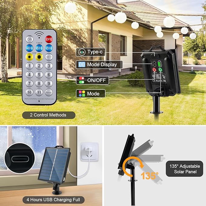 - 【Solar & USB charging】:3.7V 1200MAH Solar panels absorb energy during the day and store it in batteries for use at night. You can also connect a mobile power supply and use USB to charge when camping. Solar energy can be used for 8-10 hours on a single charge.