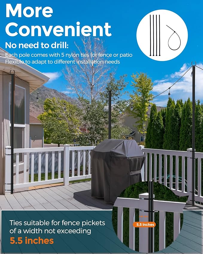- 【NO DRILL FOR FENCE】: Just tighten the tie, no need for tedious drilling.Each light pole come with 5 outdoor-specific nylon self-locking cable ties, which can be used to fix on fences such as garden, patio, deck, etc.; The length of the ties is 15.7'' (40cm), and is suitable for wooden or iron fences with a width not exceeding 5.5'' (14cm). Please measure the fence size before purchasing.