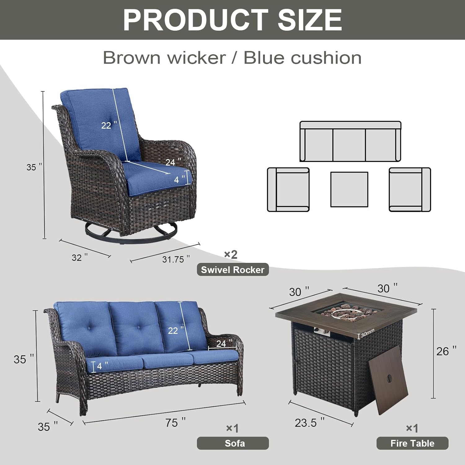 Outdoor Patio Furniture Set with 50000BTU Propane Fire Pit Table, 4 Pieces Wicker Patio Conversation Set with 2 Swivel Rocker Glider Chairs Rattan Sofa Blue Cushion Perfect for Casual Gathering