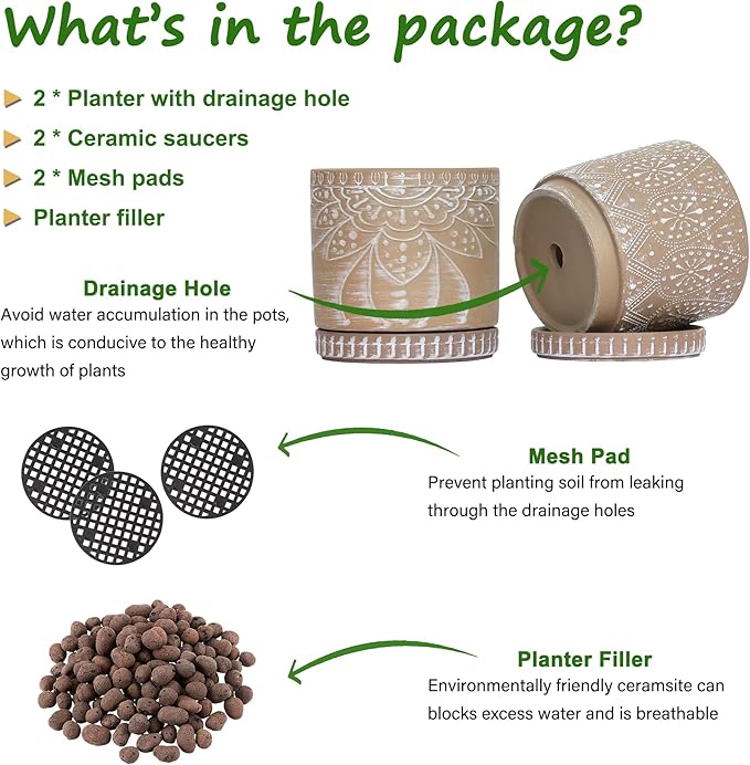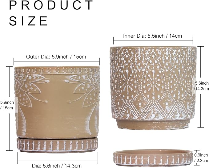 6 Inch Indoor Plant Pots with Drainage Holes and Saucers, Ceramic Planter for Plants, Flower Pot - Set of 2