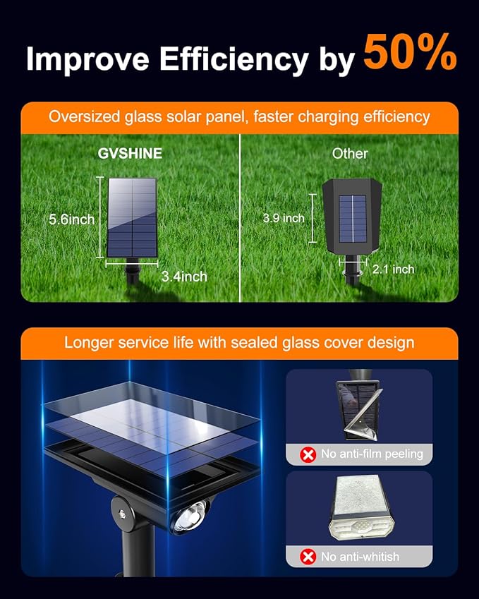 - High Efficiency with Large Glass Solar Panel: GVSHINE's outdoor solar spotlight features an oversized sealed glass cover design (5.6*3.4 inches). Unlike other spotlights with ordinary solar panels, our design prevents rapid aging and whitening of the solar panel from prolonged exposure to sunlight, ensuring proper functionality. Our solar spotlights equipped with a high-capacity 1800mAh battery, it charges for 5-6 hours during the day to provide 6-18 hours of illumination at night.
