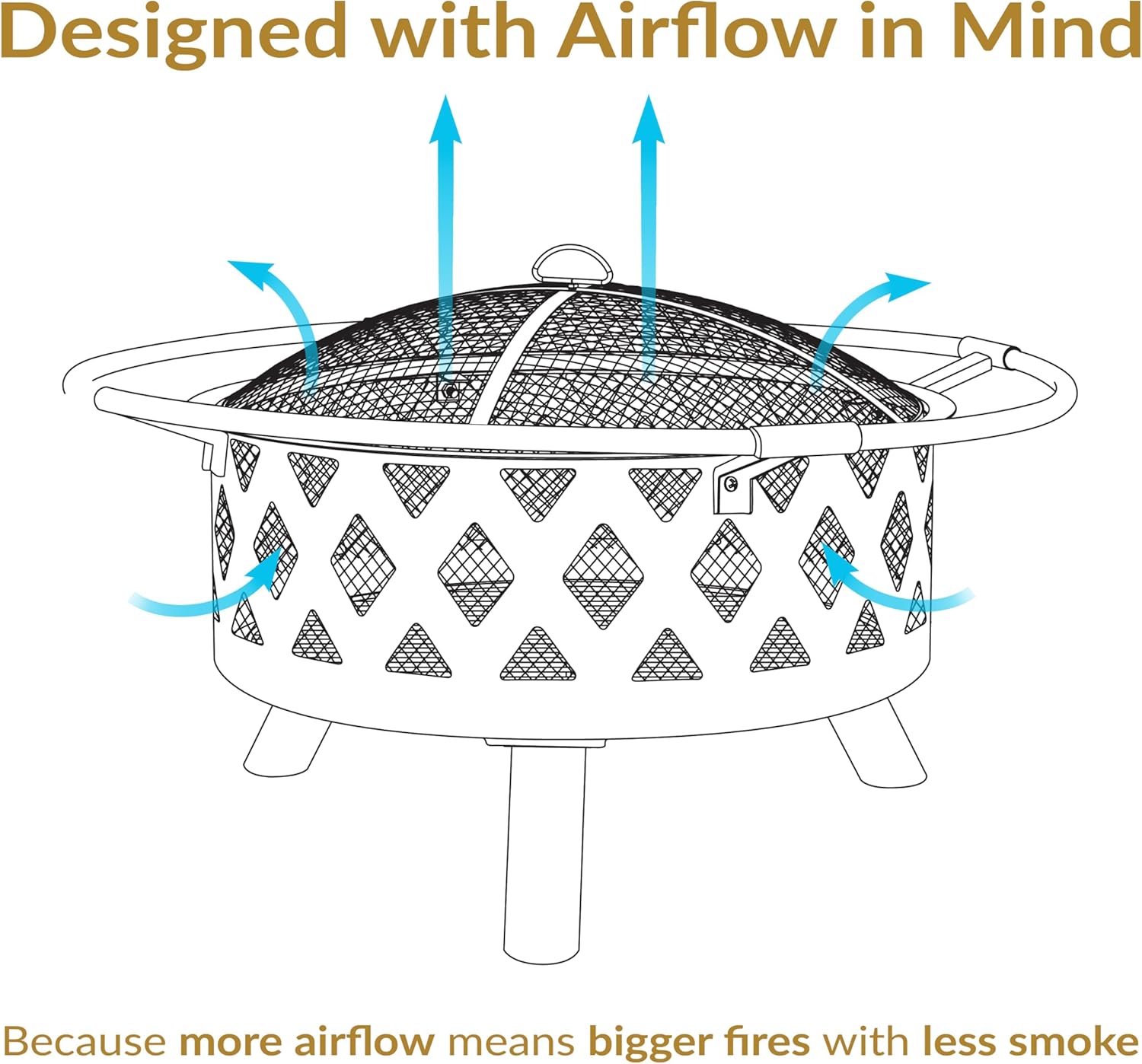 - IMPROVED AIRFLOW AND SAFETY: The outdoor fireplace for patio includes a metal spark screen and mesh-covered cutouts for added safety from flying sparks, a weather-resistant round cover, and a poker tool to safely maneuver the burning logs. The outer ring also ensures that everyone remains a safe distance from the flames. The fire pit features a wood-burning grate and cutouts for better airflow. This allows the fire to burn steadier for long-lasting fires with less smoke and more heat.