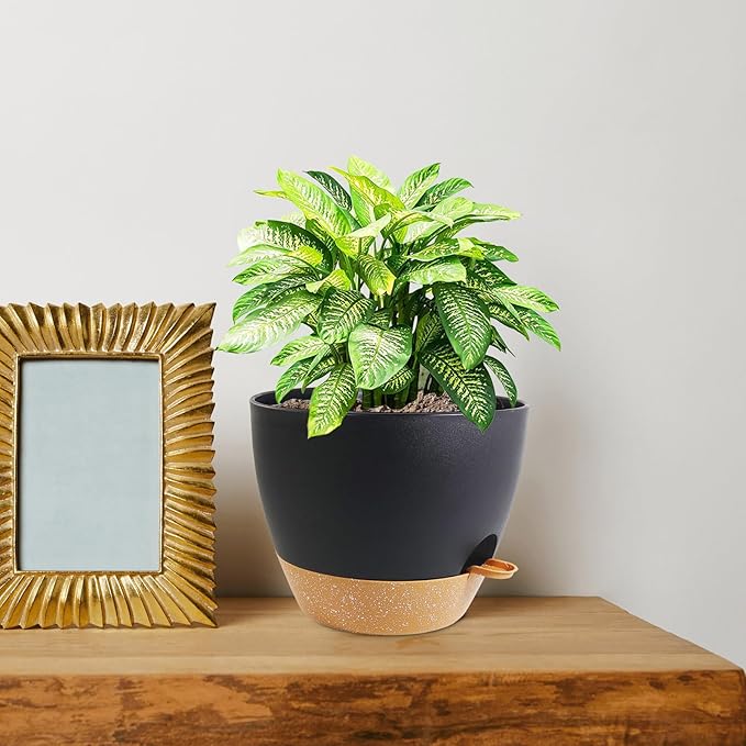 10 inch Self Watering Pots, 2 Pack Plastic Planters with Mesh Drainage Holes for Garden Plants and Flower, Plants Pots with Deep Reservoir for Indoor Outdoor Plants, Black with Brown
