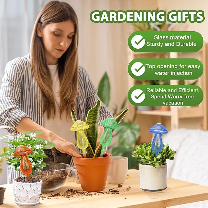 - 【Sturdy Glass】:Mushroom and plant water balls are made of high-quality handblown glass,Sturdy glass. Each self watering globes is crafted with special care,each box has four colors, allowing you to clearly see the amount of water inside.It emits a laser glow under the sunlight, adding decorative colors to your planting area.