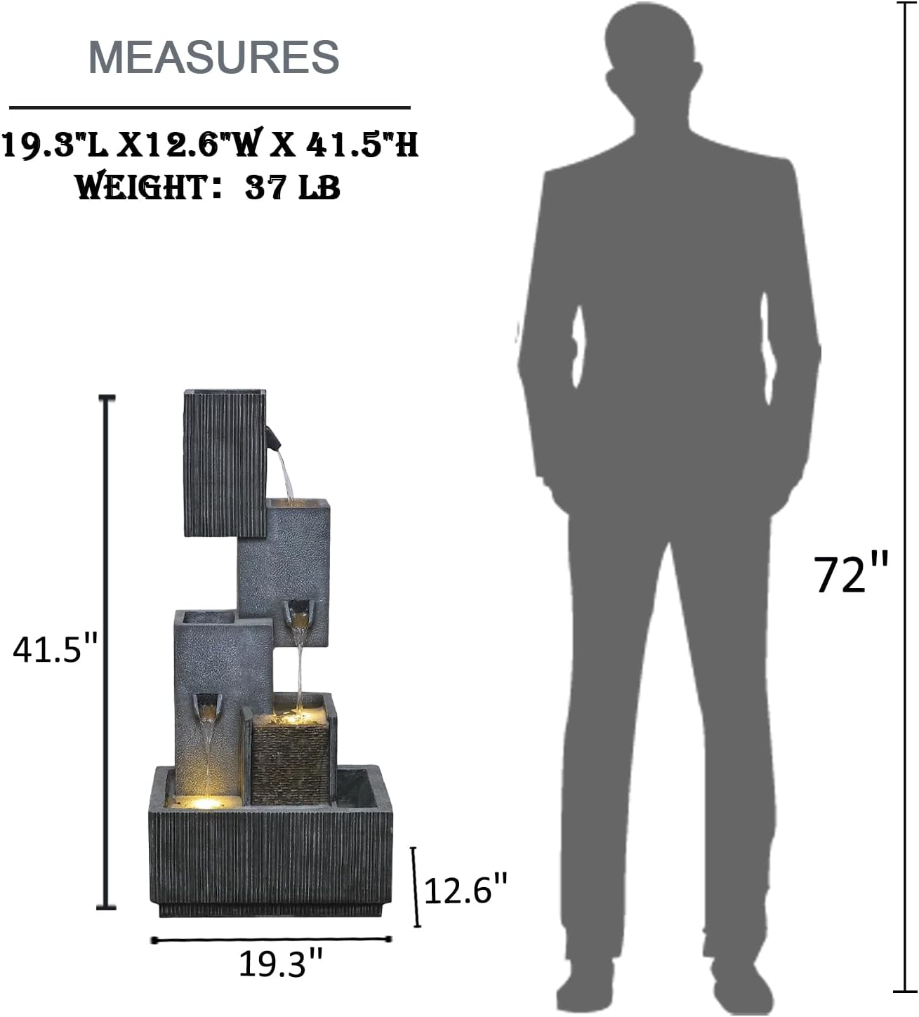 Tiered Water Fountain Outdoor Garden - Waterfall Patio Freestanding Cascade Fountains Concrete Artistry Modern Style with LED Lights for Yard Pool Home Decor, 41.5 inches Tall