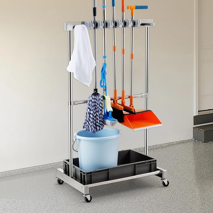 - Convenience at Its Best: The lawn tool organizer comes with 4 swivel wheels (2 of them with brakes) for easy movement between spots. It's got your back with a handy PP tray at the bottom that stops wet mops from dripping and keeps your floor squeaky clean.