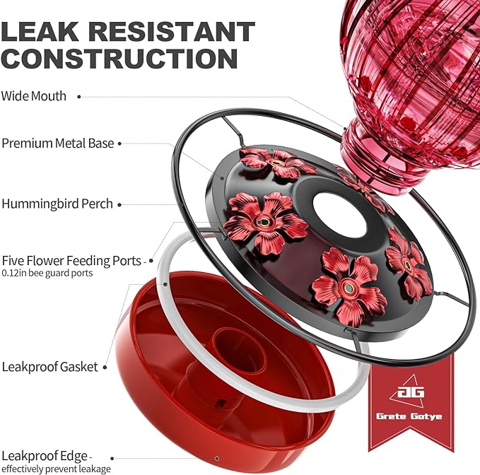 - 🪽EASY TO REFILL AND CLEAN: The super wide-mouth bottle design is easy to fill and clean, The whole glass hummingbird feeder could be disassembled smoothly for easy cleaning. With a clear bottle, you can easily monitor the hummingbird nectar level and refill it promptly, ensuring a steady supply for your feathered friends.