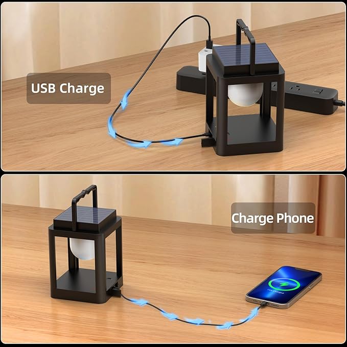 - 𝐓𝐰𝐨 𝐂𝐡𝐚𝐫𝐠𝐢𝐧𝐠 𝐌𝐨𝐝𝐞𝐬:Solar lanterns lights have 2 charging modes: solar panel and USB charging. Indoor can be used by USB charging; Outdoor lights can be charged by the solar panel on the top.Solar garden lanterns built-in 4800mAh battery, working time up to 8-10h, multiple charging modes can be used even on cloudy days