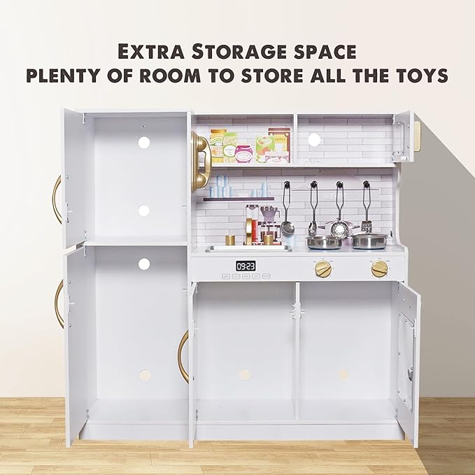 - 🎄 Simulated Design - Wooden Play Kitchen with Lights. Oven, cabinet, freezer, refrigerator and microwave doors open and close. Equipped with a variety of realistic cooking utensils,make pretend play more lively and interesting. Create an immersive play experience for children and kids