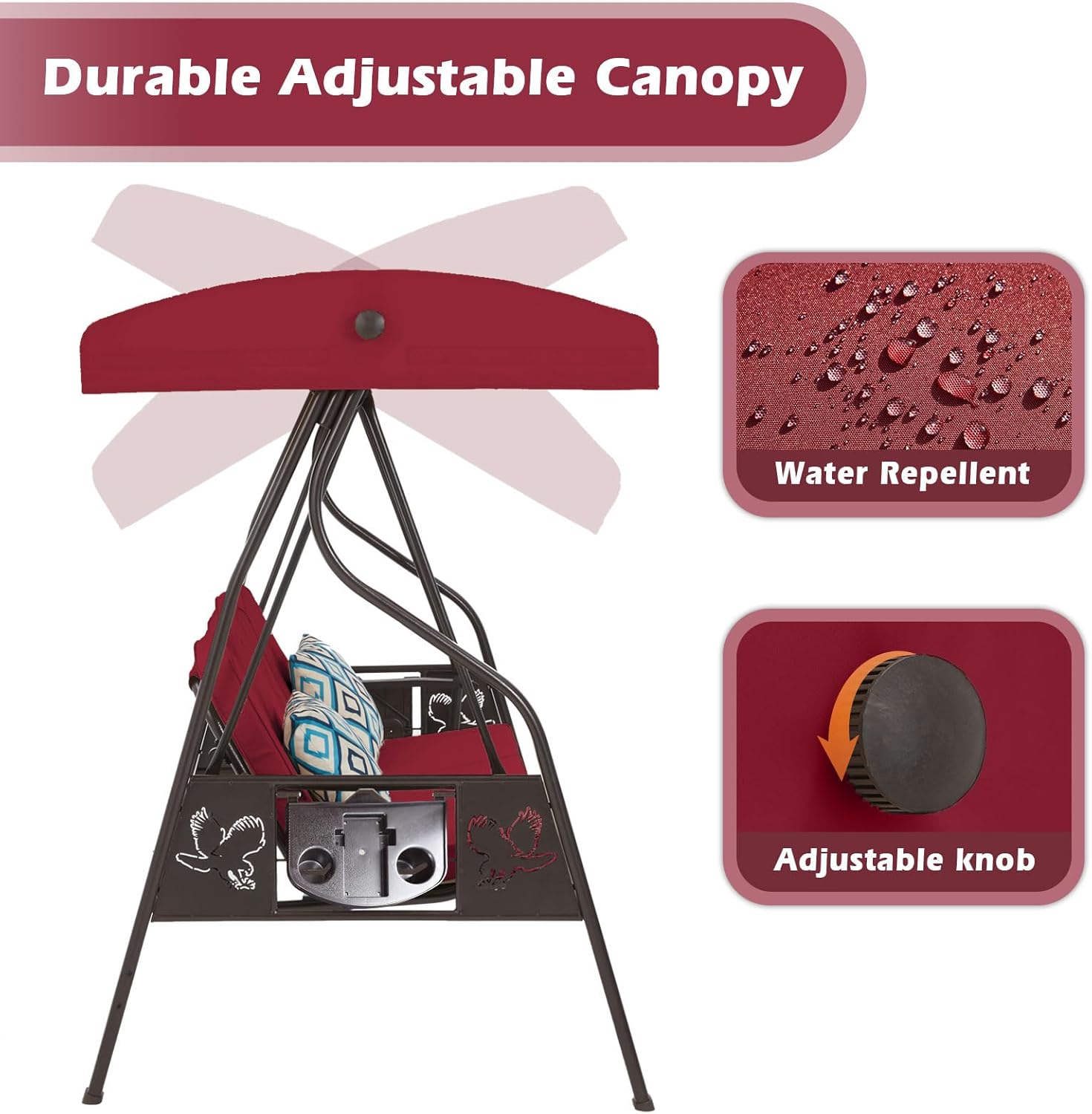 3-Seat Outdoor Porch Swing with Stand, Patio Swing with Canopy, 2 in 1 Porch Swing Bed & Patio Swing Chair for Adult w/Extra Pillows and Cup Holder for Yard (Wine Red)