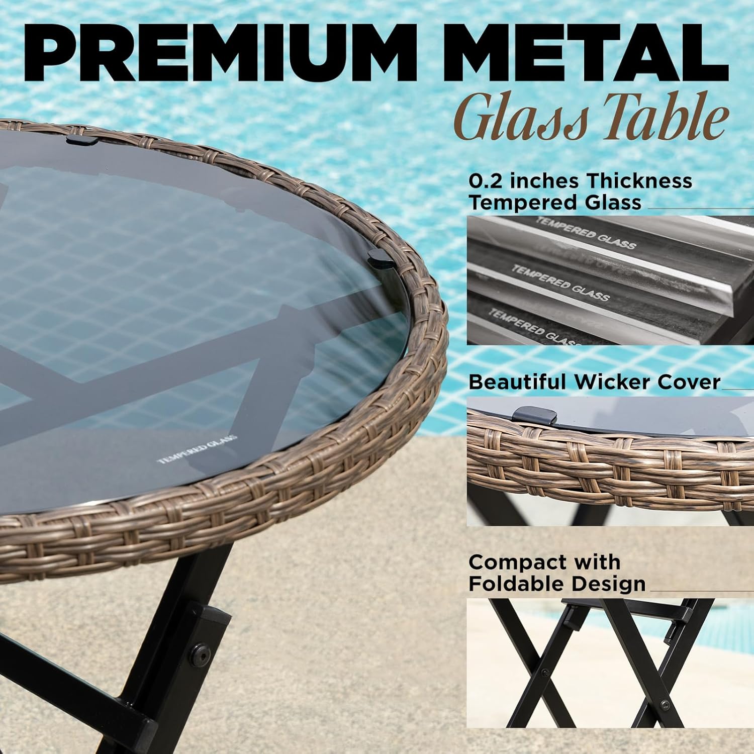 - Easy to Clean and Maintain: Rustproof metal support legs and the tempered glass tabletop are simple to clean and maintain. Just wipe clean with a damp cloth when stained. This patio furniture set is suitable for poolside, lawn, garden patio, backyard, deck, porch, balcony, terrace, or anywhere else, ideal for sharing wine and relaxing