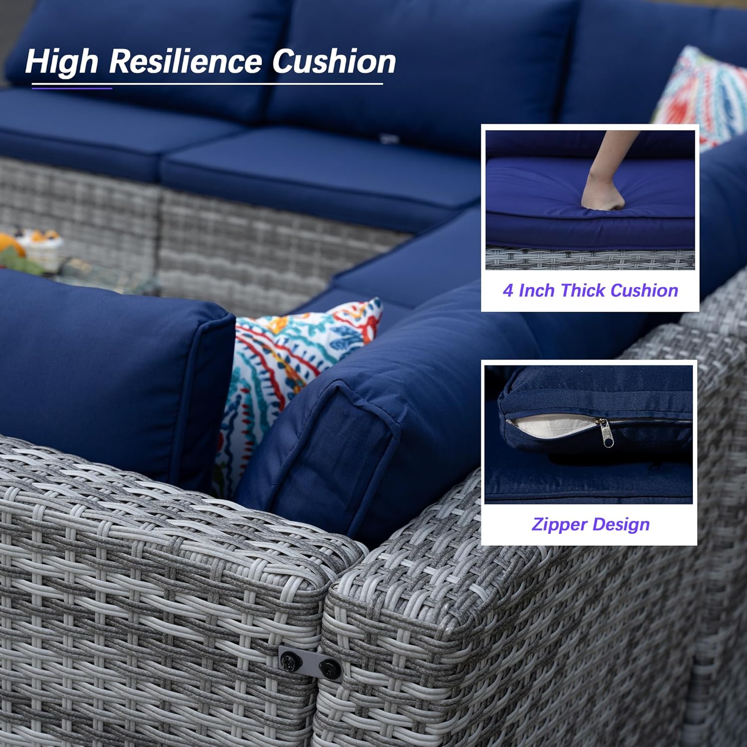 - Thick Cushions & 2 Extra Pillows for Comfort: Our outdoor sectional includes plush 4" water-resistant cushions plus 2 extra pillows for added back support and style. The removable, washable covers make it easy to maintain your patio sofa, while the fade- and stain-resistant fabric ensures this wicker outdoor furniture always looks fresh