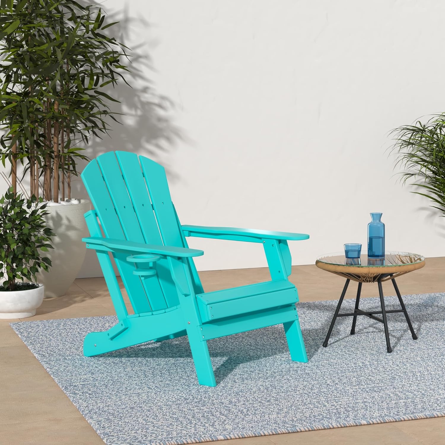GREENVINES Folding-Adirondack-Chairs-Set-of-4 | HDPE All-Weather | Firepit Chair | Cup Holder | Aqua | for Campfire Deck Backyard Patio Outdoor Poolside Lawn