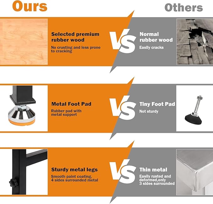 - Solid Wood & Reinforcing Rod: 70" x 21" solid rubber wood top with metal frame, the weight load capacity of this heavy duty workbench over 2000 lbs, the extra support rod to make the table more stable horizontally