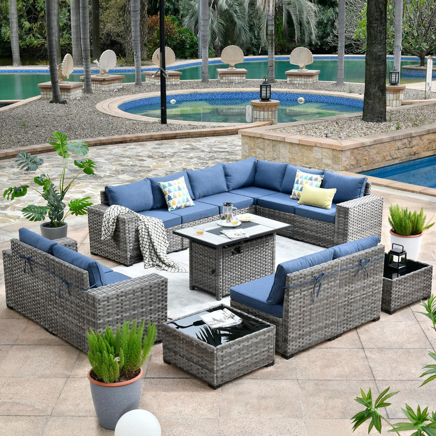 HOOOWOOO 13 Piece Modular Patio Outdoor Sectional Furniture Set with Gas Propane Fire Pit Table,Wicker Conversation Sofa Set,Out Door Couch Set with Wide Arm Outside(Denim Blue)
