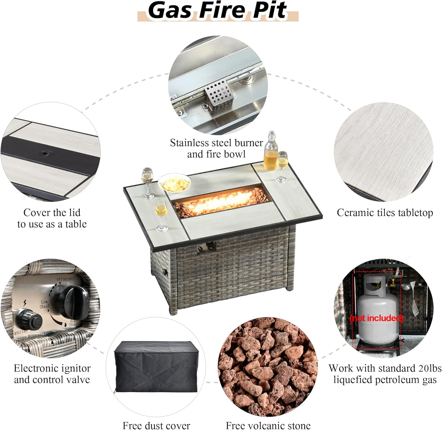 HOOOWOOO 9 Piece Modular Patio Outdoor Sectional Furniture Set with Large Propane Fire Pit Table,Wicker Conversation Sofa Set with Swivel Chairs,Outside Couch Set(Beige)