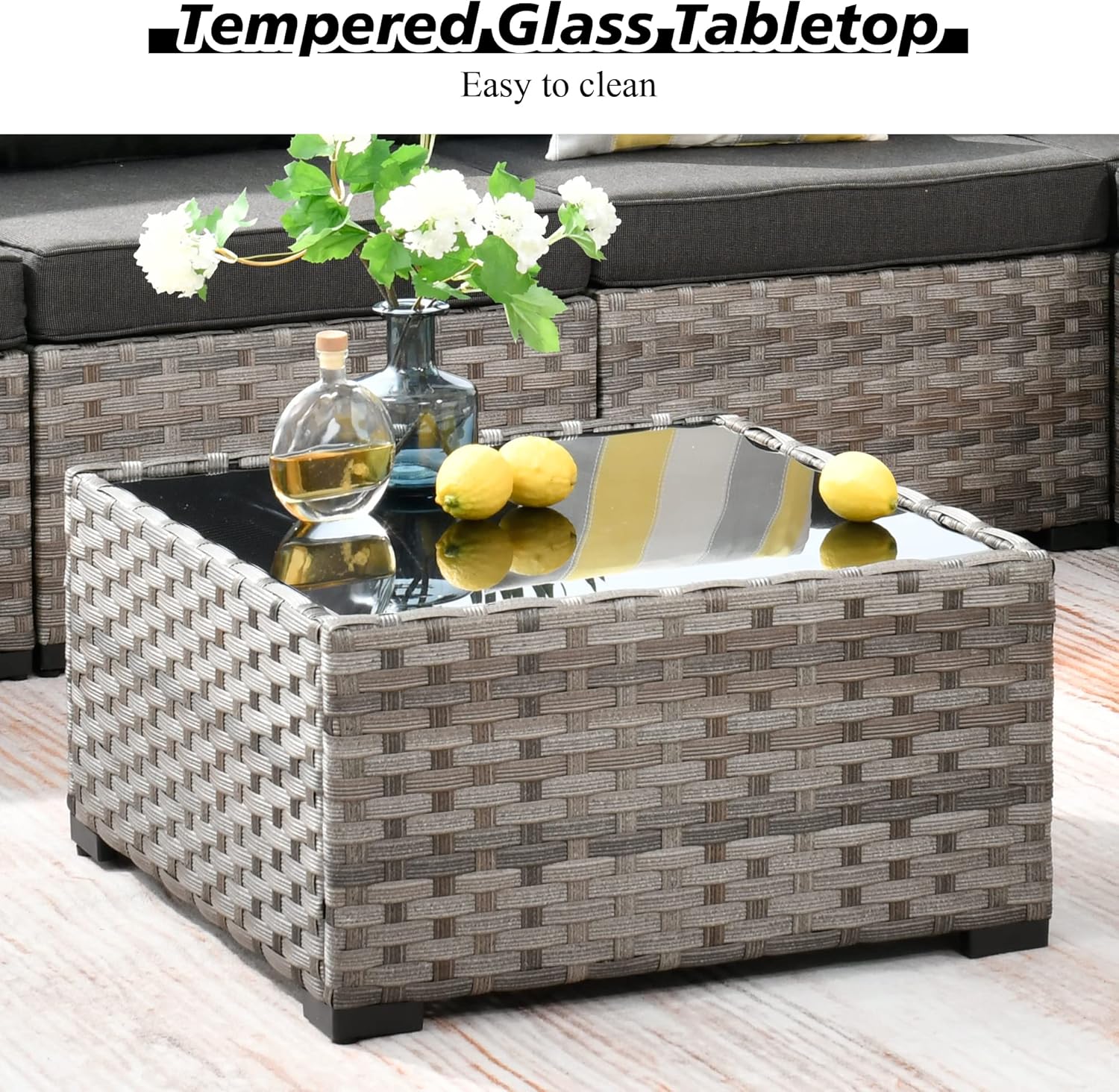 - Weather Resistance: PE strengthen wicker UV treated for long lasting. Cushions with yarn dyed woven cover features with UV-resistance, water drops/spilt resistance and good ventilation, resists water drops, coffee spilt. Unlike cheaply made thin print fabric, yarn dyed woven fabric got beautiful texture