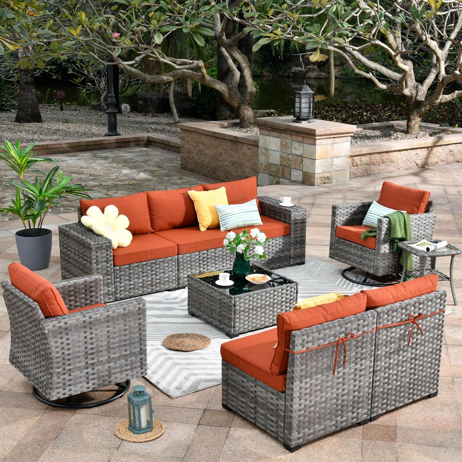 HOOOWOOO 9 Piece Modular Patio Outdoor Sectional Furniture Set with Swivel Rocking Chairs,Wicker Conversation Sofa Set,Outside Couch Set with Wide Arm(Orange Red)