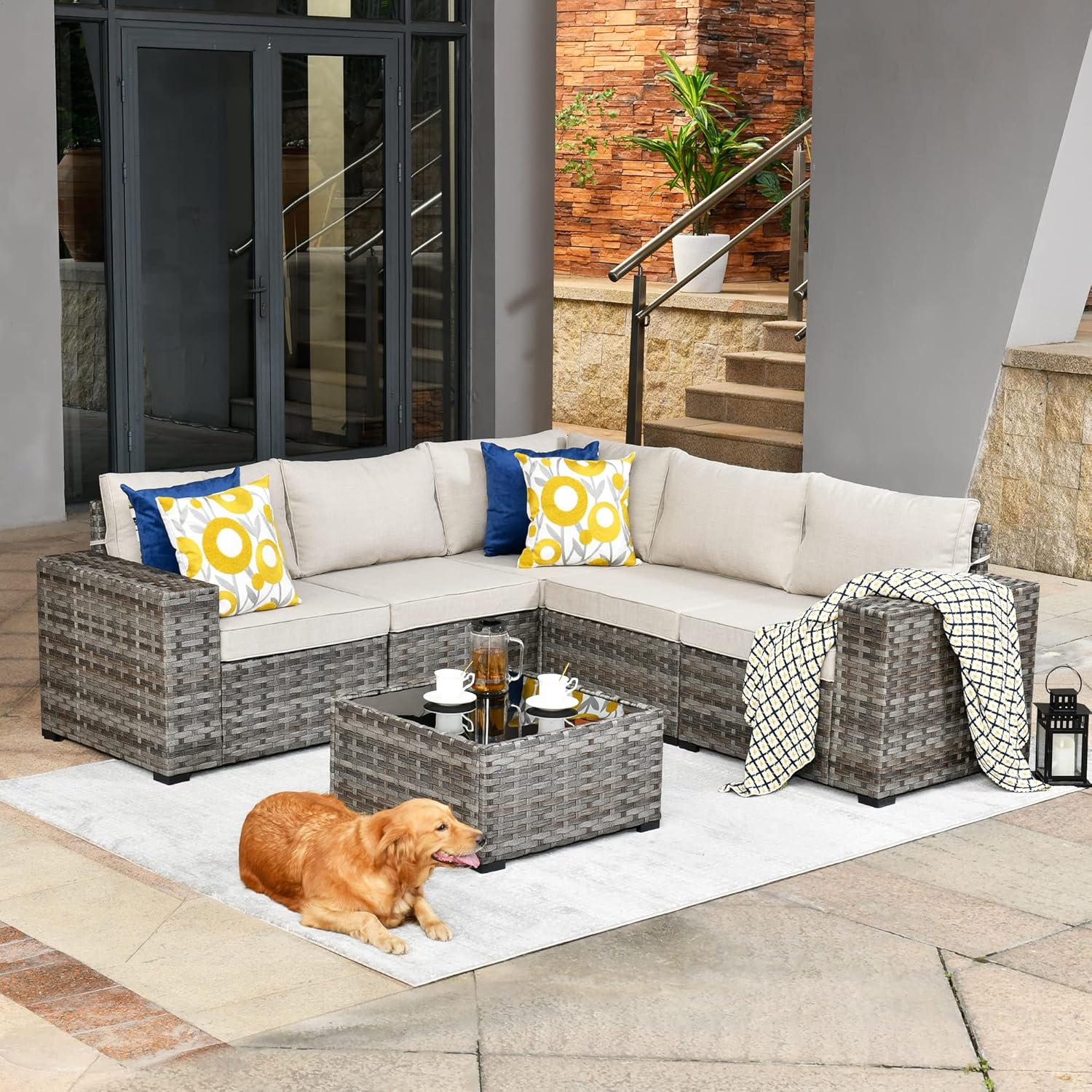 HOOOWOOO Modular Patio Outdoor Sectional Furniture Set,6 Piece Wicker Conversation Sofa Set,Out Door Couch Set with Wide Arm for Outside All Weather(Beige)